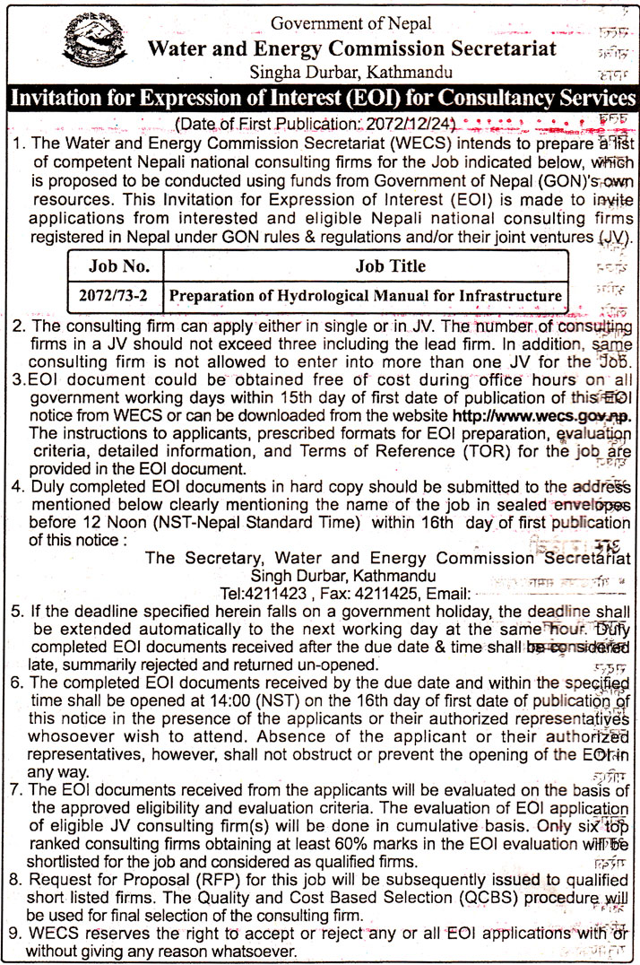 Invitation for Expression of Interest (EOI) for Preparation of Hydrological Manual for Infrastructure